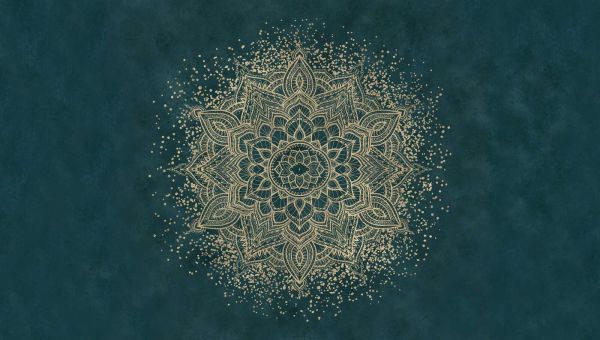 Goldene Mandala auf smaragdgrün in verschiedenen Materialien