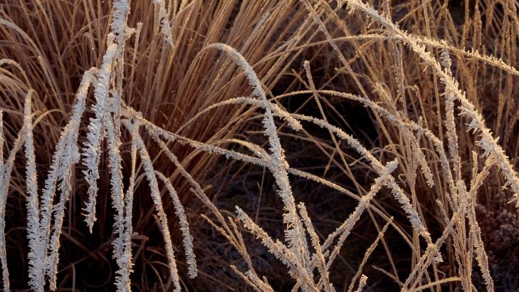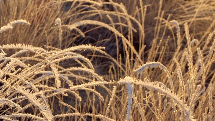 Schöner Raureif auf den Gräsern während eines Sonnenaufgangs. Kombinieren Sie diese Fototapete in Ihrer Wohnung und schaffen Sie noch mehr Atmosphäre.