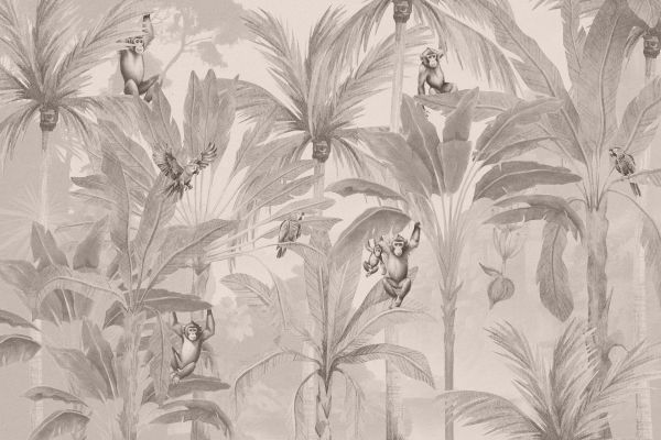 Entdecken Sie eine elegante Symphonie aus Grautönen, die mit den Silhouetten tropischer Palmen verflochten ist. Dieses Design fängt die Essenz einer ruhigen Oase ein, in der verspielte Affen zwischen den Blättern herumtollen, eine Szene, die sowohl Frieden als auch Lebendigkeit atmet.