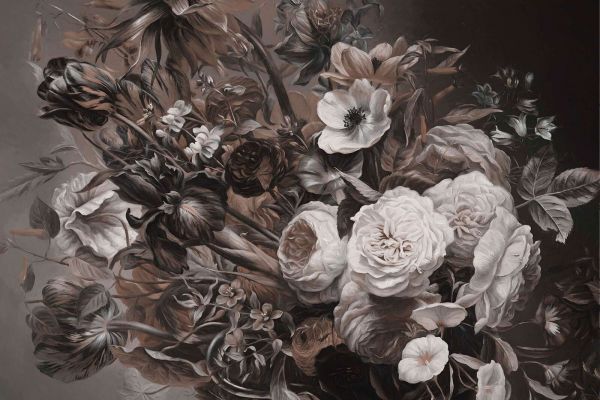 Dieses beeindruckende Design erweckt die Atmosphäre eines klassischen Blumenstilllebens zum Leben mit einer harmonischen Palette aus warmen Sepia-, Creme- und Erdtönen. Die üppigen Blumen, darunter Rosen, Tulpen und zarte Wildblumen, sind raffiniert gegen einen subtil vergräuerten Hintergrund angeordnet, wodurch eine nostalgische und elegante Ausstrahlung entsteht. Die dramatischen Schatten und sanften Pinselstriche verleihen Tiefe und verstärken den zeitlosen Charakter des Designs. In einem klassischen Interieur bildet dieses Muster eine wunderschöne Ergänzung zu reichen Hölzern, samtigen Stoffen und antiken Details in Gold oder Bronze. In einem modernen oder industriellen Interieur kann dieses Design hingegen einen interessanten Kontrast bieten, insbesondere in Kombination mit klaren Linien, Betontönen und schwarzen Akzenten. Die warmen Sepia-Untertöne schaffen eine raffinierte, einladende Atmosphäre, die in verschiedenen Stilen zur Geltung kommt. Die subtile und stimmungsvolle Farbkombination macht dieses Design ideal für Räume, in denen eine luxuriöse und beruhigende Atmosphäre gewünscht ist. Denken Sie an ein elegantes Esszimmer, ein stilvolles Wohnzimmer oder ein klassisches Schlafzimmer. Auch in einem Boutiquehotel, einer exklusiven Boutique oder einem schicken Café kann dieses Muster eine charmante und zeitlose Ausstrahlung erzeugen. Mit seiner warmen, nostalgischen Ausstrahlung und der raffinierten Blumenkomposition bringt dieses Design ein Gefühl von Ruhe und Eleganz in jeden Raum. Es ist eine perfekte Wahl für Liebhaber von Vintage- und klassischen Stilen mit einem subtilen, künstlerischen Twist.