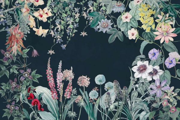 Dieses Design strahlt durch eine harmonische Mischung aus Blumen und Pflanzen eine bezaubernde Schönheit aus, die sowohl Eleganz als auch Verspieltheit widerspiegelt. Die reichen Details der Blätter und Blüten, kombiniert mit einer dezenten Palette aus Pastellfarben und sanften Erdtönen, machen es lebendig und raffiniert. Die anmutige Komposition schafft eine einladende Atmosphäre, perfekt für Räume, die ein ruhiges und natürliches Erscheinungsbild erfordern.