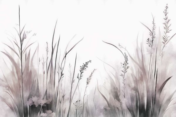 Ein stimmungsvolles Design mit sanften, nebligen Gräsern und raffinierten Blumen, ausgeführt in grau-grünen und warmen Erdtönen. Die subtilen Pinselstriche und traumhafte Komposition schaffen eine serenen, fast poetischen Atmosphäre. Der helle Hintergrund verstärkt das Gefühl von Räumlichkeit und bringt einen Hauch beruhigender Natur ins Innere.