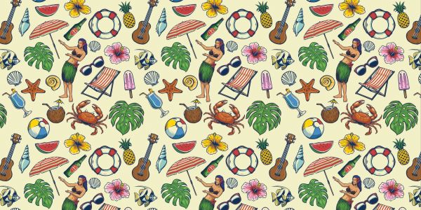 Buntes Sommermuster mit Blättern, Muscheln und Blumen.