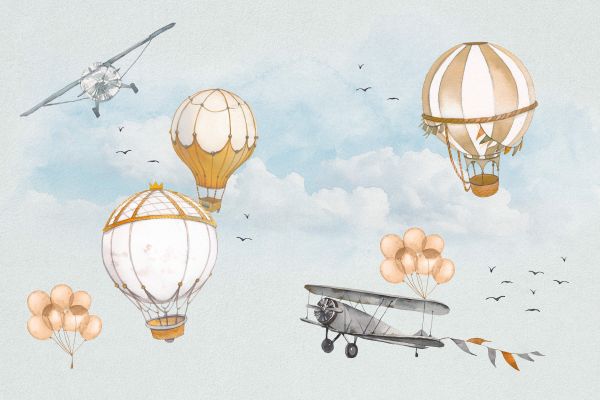 Ein fröhliches Aquarellfoto mit Luftballons in neutralen Farben, ideal für Jungen und Mädchen und Babyzimmer.
