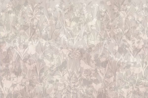Ein zartes Design, bei dem Schmetterlinge und krautige Blumen in einem Schichtenspiel aus sanften Pastelltönen zusammenkommen. Die subtile Silhouette von Flora und Fauna schafft eine ruhige und zeitlose Atmosphäre.