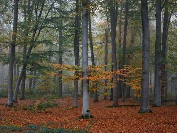 Schöne Herbstfarben in einem nebligen Wald. Kombinieren Sie diese Fototapete in Ihrer Wohnung und bringen Sie ein Stück Wald in Ihr Zuhause.