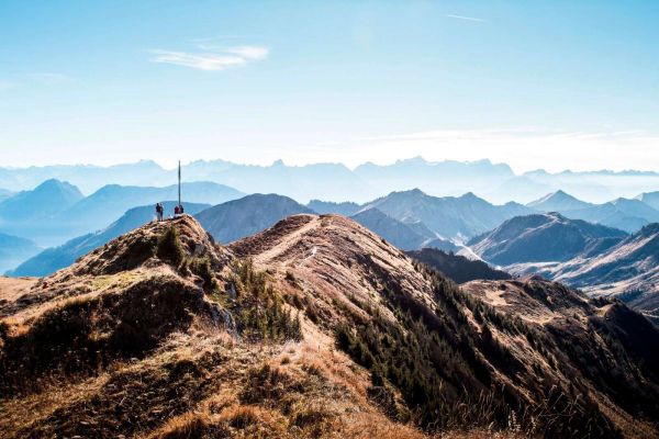 Sanft abfallende Bergkämme in warmen Herbsttönen erstrecken sich unter einem klaren blauen Himmel. Wanderer stehen auf dem Gipfel, umgeben von Sonnenlicht und der Stille der Natur.