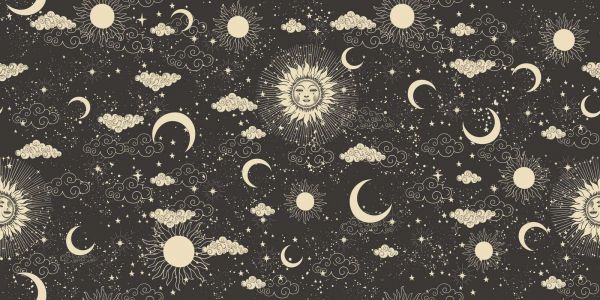 Eine bezaubernde Nachtszene mit anmutigen Sonnen, Monden, Sternen und Wolken in klassischem Stil auf einem tiefschwarzen Hintergrund. Die Gestaltung strahlt Mystik, Eleganz und astrologische Raffinesse aus.