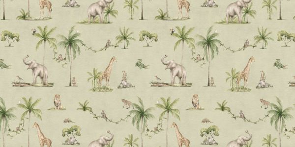 Ein fröhliches Dschungelmuster mit exotischen Tieren wie Elefanten, Giraffen, Löwen und Leoparden, zwischen Palmen und grünem Laub. Der helle Hintergrund und die detaillierten Illustrationen schaffen eine verspielte und luftige Atmosphäre, ideal um jedem Raum eine abenteuerliche Note zu verleihen.