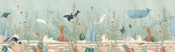 Dieses träumerische Unterwasserland nimmt dich mit in die ruhigen Tiefen des Ozeans, wo eine bunte Ansammlung von Meeresbewohnern friedlich umherschwimmt. Zwischen dem wehendem Seegras und Korallenriffen entdeckst du neugierige Orcas, freundliche Wale, elegante Rochen, Meeresschildkröten und Schwärme kleiner Fische. Auch Seelöwen, Otter, Quallenarten und Krabben finden ihren Weg zwischen bunten Muscheln und sanften Sandbänken. Die Farbpalette besteht aus ruhigen Aquatönen, Hellgrün, Blau-Grau und zartem Rosa, die zusammen eine beruhigende, natürliche Ausstrahlung erzeugen. Der Illustrationsstil ist weich und handgezeichnet, mit fließenden Konturen und einer harmonischen Komposition, die die Unterwasserwelt auf spielerische Weise wiedergibt, ohne visuelle Überladung. Dieses Design passt perfekt in ein skandinavisches oder verspieltes maritimes Interieur, mit Akzenten aus Naturholz, weichen Stoffen, See-Thema Accessoires und hellen Wänden. Ideal für ein Kinderzimmer mit einem Ozean- oder Strandmotiv, wo das Design eine beruhigende und zugleich fantasievolle Atmosphäre hinzufügt. Denken Sie an eine Kombination mit Holzmöbeln, Aufbewahrungskörben in Fischform und Textilien mit Seesternen oder Muschelmotiven. Sehr geeignet für Babyzimmer, Kleinkindzimmer oder Spielbereiche, in denen Entspannung und Fantasie Hand in Hand gehen. Das Unterwasserleben bleibt eine Einladung zum Entdecken: Welches Tier schwimmt dort? Wo versteckt sich die Schildkröte? Der freundliche Ausdruck jedes Tieres macht das Design zugänglich für kleine Kinder. Mit seinen detailreichen Szenen, ruhigen Farben und sanften Ausstrahlung schafft dieses Design einen Ruhepunkt in jedem Raum – eine Unterwasserwelt voller Leben, ohne Hektik, perfekt im Gleichgewicht.