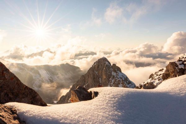 Ein friedliches Winterbild mit einer strahlenden Sonne, die die verschneite Berglandschaft und die schwebenden Wolken in einem sanften, goldenen Glanz hüllt. Die frische Klarheit der Luft verstärkt das Gefühl von Weite und Ruhe.