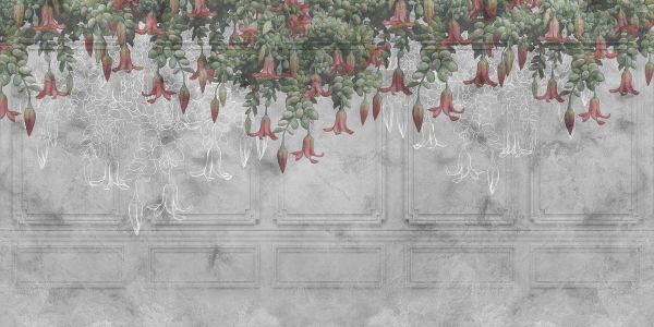 Klassische graue 3D-Verkleidung mit von oben herabhängenden Blumen in Grün und Rot.