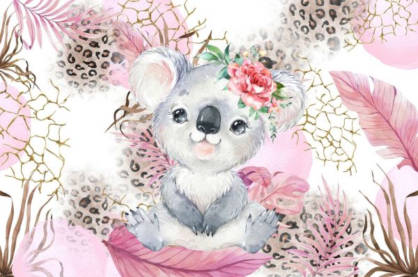 Wunderschöne Tapete mit einem kleinen weiblichen Koala in einer braunen und rosa Savannenumgebung.