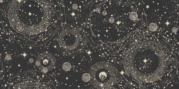Ein faszinierender Sternenhimmel voller spiralförmiger Sterncluster, Planeten und Sternbahnen in sanftem Creme auf schwarzem Grund. Das Design strahlt Mystik, Bewegung und räumliche Tiefe aus.