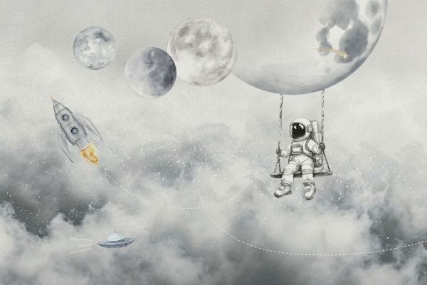 Diese Illustration zeigt eine lebendige Szene mit Raumfahrzeugen, die anmutige Bahnen um detailliert gezeichnete Planeten ziehen, alle in ein weiches, nebliges Licht getaucht. Es ist eine verspielte Mischung aus Fantasie und Realismus, eingefangen in einer gedämpften Farbpalette.