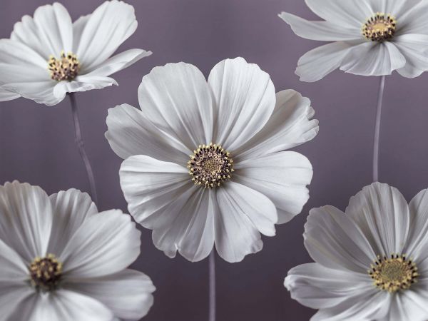 Die Kosmosblüten haben einen leicht dunklen Hintergrund, der die Blüten hervorhebt.