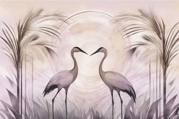 Zwei elegante Kraniche stehen harmonisch einander gegenüber, umgeben von geschwungenen Palmen und einem subtil geschichteten Hintergrund. Die sanften Beige- und Graubrauntöne strahlen Gelassenheit und Ruhe aus. Der zarte Aquarellstil und die symmetrische Komposition verleihen dem Gesamtbild eine traumhafte, fast meditative Ausstrahlung.