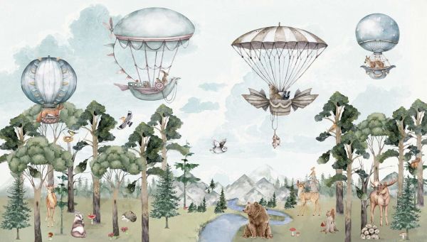 Eine verspielte Berglandschaft, in der Tiere zwischen Bäumen wandern und in fantasievollen Heißluftballons fliegen. Voller Farben, Abenteuer und fröhlicher Details in einer frischen, traumhaften Atmosphäre.