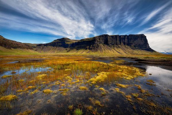 Ein Sommerfoto von einem überwucherten See mit einer hohen Klippe im Hintergrund.