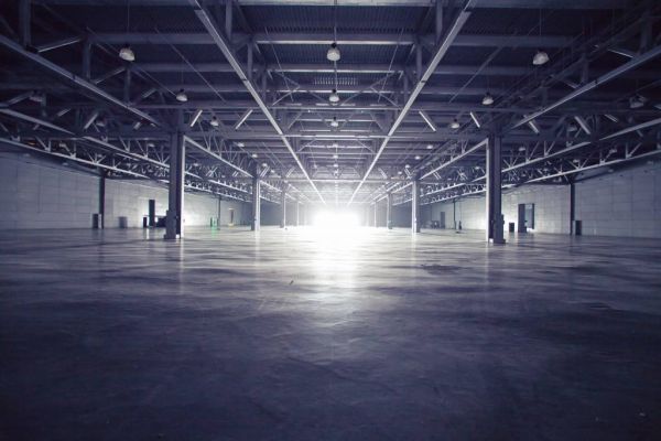 Fototapete mit einem dunklen Lagerhaus und einer beleuchteten Öffnung am Ende.