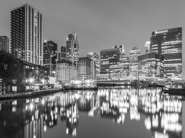 London bei Nacht in Schwarz und Weiß. Im Wasser kann man die Spiegelung der Gebäude sehen.