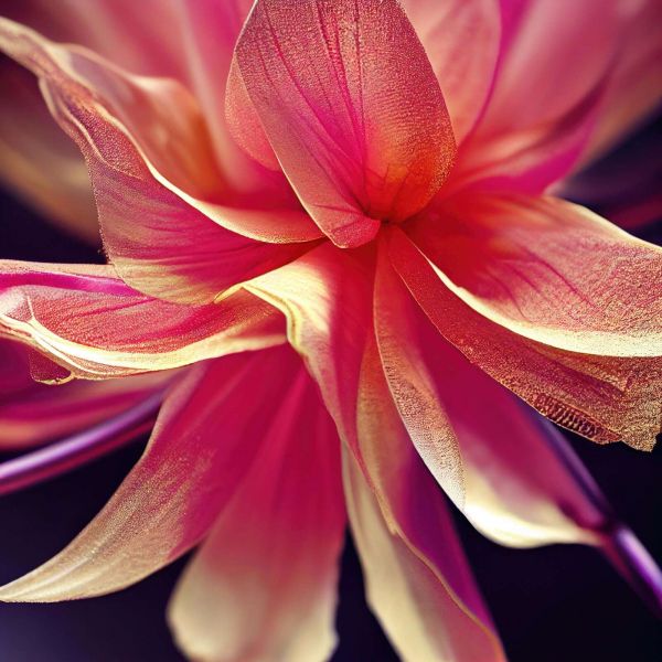 Eine dramatische Blume in den Farben leuchtendes Pink, Orange und Gold scheint von innen heraus zu lodern. Die weiche Textur und fließenden Linien erzeugen ein warmes, luxuriöses und intensives Bild.