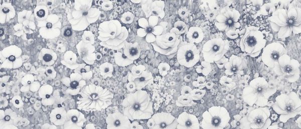 Ein subtiles monochromes Blumenfeld, ergänzt durch helle Blautöne, die eine raffinierte, fast pastellartige Ausstrahlung haben. Die Mohnblumen und Wildblumen scheinen sanft im Wind zu wiegen, was eine ruhige und poetische Atmosphäre schafft.
