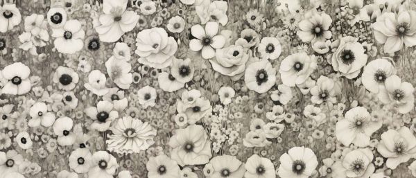 Ein wunderschönes monochromes Blumenfeld mit detaillierten Mohnblumen und wilden Blumen in sanften Schwarz-Weiß-Tönen. Die subtilen Kontraste und feinen Schatten verleihen dem Design eine klassische, zeitlose Ausstrahlung. Der zarte, fast illustrierende Stil bringt eine ruhige und raffinierte Atmosphäre in jeden Raum.