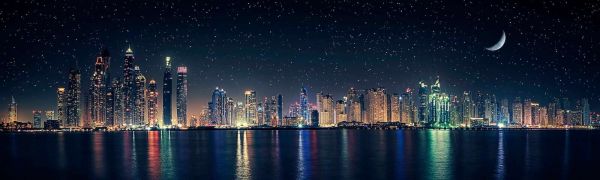 Eine atemberaubende Nachtsicht auf eine moderne Skyline voller Lichtreflexionen, unter einem funkelnden Sternenhimmel mit einem schmalen Mond. Der bunte Glanz der Wolkenkratzer spiegelt sich lebhaft im ruhigen Wasser.