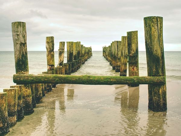 Wunderschöne Bilder von bemoosten Buhnen im Wasser und Möwen im Hintergrund.