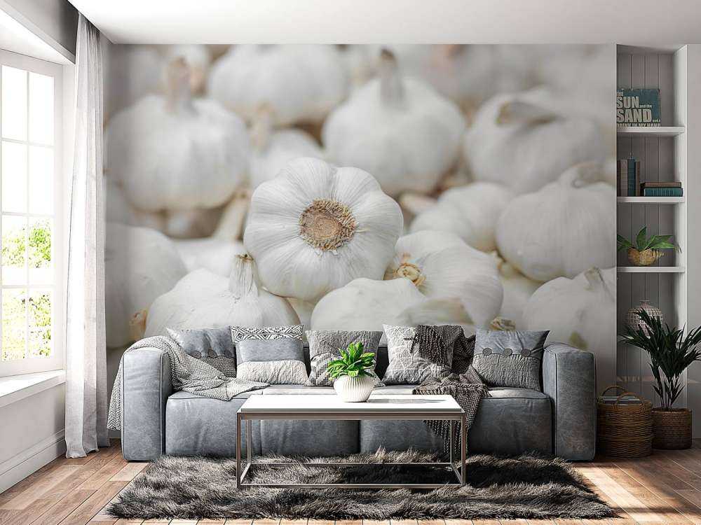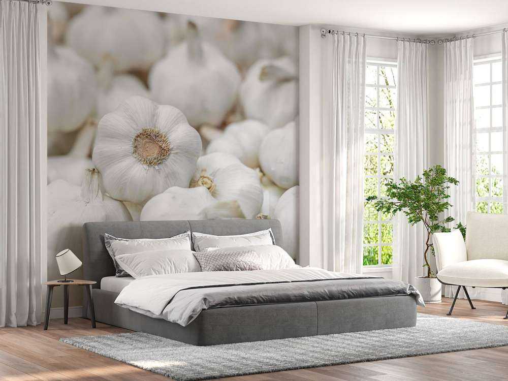 Nahaufnahme eines Knoblauchhaufens. Kombinieren Sie diese Fototapete zum Beispiel in der Küche.
