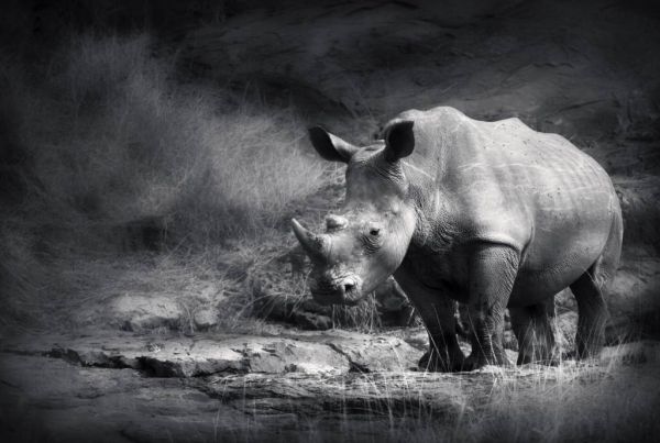 Tapete mit einem Schwarzweißfoto eines Nashorns in der wilden Natur.