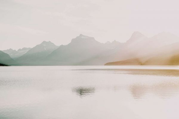 Ein friedliches Bergpanorama in Pastelltönen, wo die sanfte Morgensonne nebliges Licht über die Gipfel und den spiegelglatten See wirft, in einer beinahe träumerischen Atmosphäre.