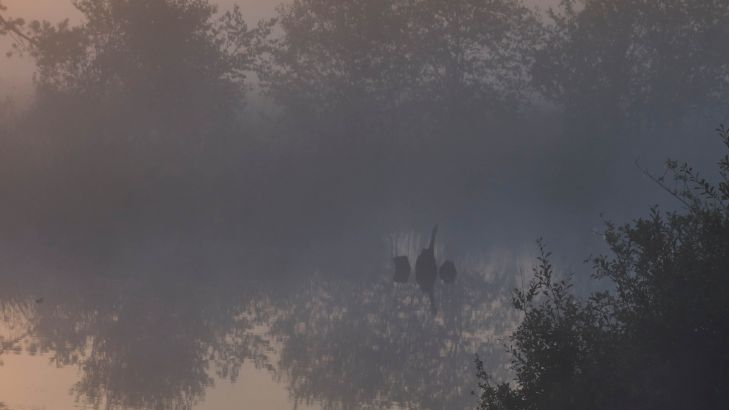 Nebel bei Sonnenaufgang in schöner Heide mit noch reflektierendem Wasser