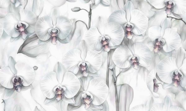 Diese sanfte, aber dennoch frische Interpretation von Orchideen konzentriert sich auf die Kombination von reinem Weiß und hellgrünen Nuancen. Die Blumen strahlen eine natürliche Reinheit aus, während die grünen Akzente in den Blättern und dem Stängel für ein verspieltes und lebendiges Detail sorgen. Das Ganze hat eine leicht aquarellartige Ausstrahlung, wodurch jede Blüte fast zu schweben scheint. Dieses Design ist ideal für diejenigen, die Ruhe und einen Hauch von Natur in ihr Zuhause bringen möchten. In einem minimalistischen Interieur mit viel Weiß und Glas erhält der florale Druck die Möglichkeit, subtil zu glänzen, während er in einem ländlichen Ambiente mit Holzmöbeln und Leinenstoffen für einen entspannten, ländlichen Charme sorgt. Dank der feinen Abstufungen von Grün fügt sich dieses Muster mühelos in verschiedene Wohnstile ein, von modern bis klassisch. Es mildert strenge Linien und verleiht in warmen Räumen eine kühlende Note. Mit grünen Accessoires oder Pflanzen kann man die Balance im Interieur verstärken, aber auch mit neutralen Farbtönen kommt das Design wunderbar zur Geltung.