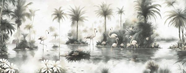 Ein üppiges tropisches Dekor in reichen Grüntönen, in dem Flamingos und exotische Pflanzen in einer mysteriösen, dschungelartigen Umgebung zusammentreffen. Der dunkle Hintergrund vermittelt ein Gefühl von Tiefe und Abenteuer, als ob man sich im Herzen der Tropen befindet.
