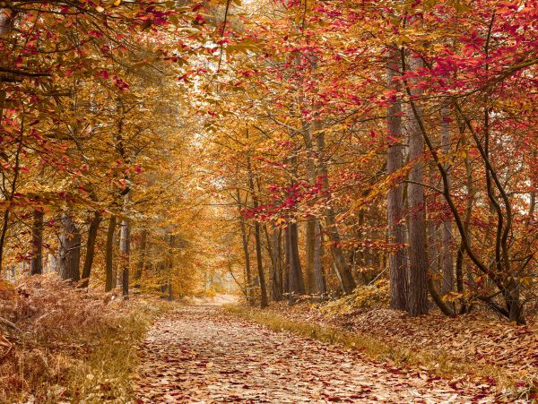 Die satten Farben des Herbstes bilden einen wunderschönen Teppich entlang dieses Waldweges. Die warme Palette der fallenden Blätter und das sanfte Licht schaffen eine beruhigende und besinnliche Atmosphäre, die perfekt für einen Herbstspaziergang ist.