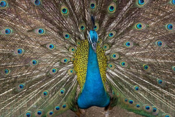 Ein bunter Pfau mit aufgeplusterten Federn auf Tapete.