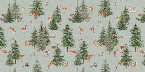 Ein stimmungsvolles Waldmuster mit Rehen, Füchsen, Bären und anderen Waldbewohnern, umgeben von majestätischen Kiefern. Die sanfte Hintergrundfarbe und die detaillierten Illustrationen erwecken die Ruhe eines Kiefernwaldes zum Leben, ideal für die Schaffung einer natürlichen und warmen Atmosphäre in jedem Raum.