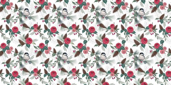 In diesem Bild entfaltet sich eine harmonische Naturszene, in der karminrote Blumen elegant gegen einen sanft gefärbten Hintergrund abstechen. Majestätische Tannenzapfen ruhen zwischen dem feinmaschigen Grün, während fröhliche Meisen sich geschickt zwischen den Ästen bewegen. Die bescheidenen Beeren fügen dem Ganzen eine subtile Süße hinzu, was zu einem Design führt, das die Ruhe und Schönheit eines Waldspaziergangs ausstrahlt.