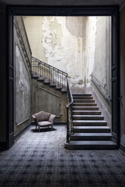 Das pittoreske Treppenhaus einer gigantischen Villa am Rande der Italienischen Alpen. Der Sessel lädt zum verweilen ein und strahlt eine gewisse Ruhe aus.