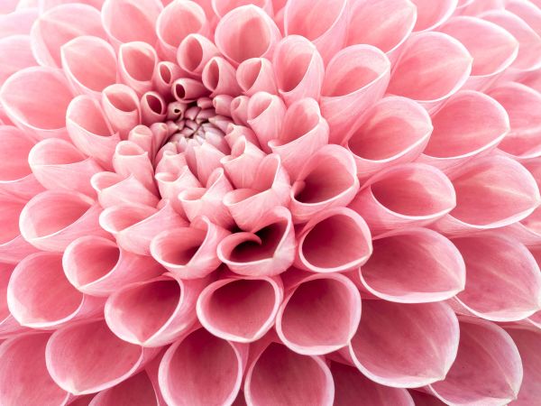 Rosa Dahlie in Nahaufnahme. Die Blätter der Blüte sind durch die Verkleinerung deutlich sichtbar.