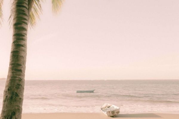 Eine ruhige tropische Meeresblickroute mit einem verwitterten Boot an der Küste, sanft wiegenden Palmen und einem ruhigen Ozean unter einem pastellfarbenen Himmel. Die Atmosphäre strahlt Ruhe, Einfachheit und natürliche Verblassung aus.