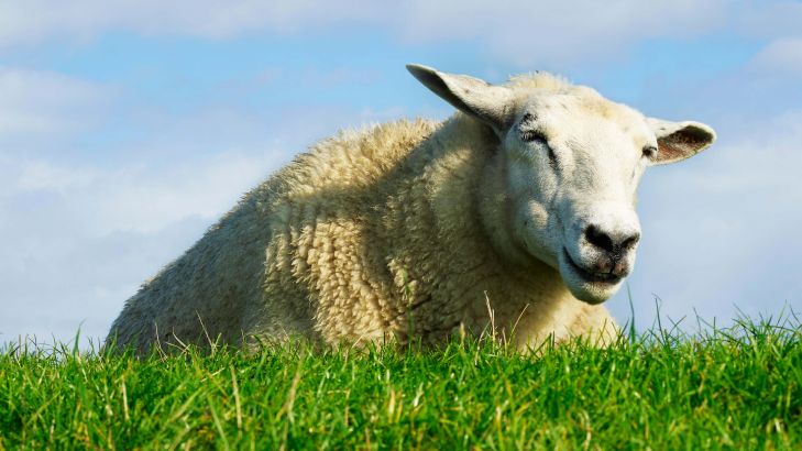Liegende Schafe auf einem Deich voller Gras an einem Sommertag.
