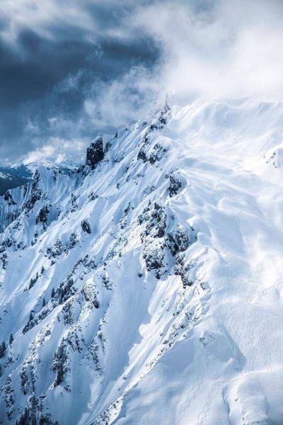 Ein raues und beeindruckendes Bergmassiv, das in dicken Schneeschichten gehüllt ist, mit drohenden Wolken darüber. Die steilen Hänge und die schroffen Felsformationen bilden ein kraftvolles Winterbild voller Bewegung und Tiefe.