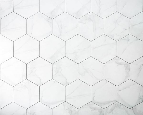 Eine weiße Marmorwand mit sechseckigen Fliesen. Kombinieren Sie dies im Raum für mehr Atmosphäre.