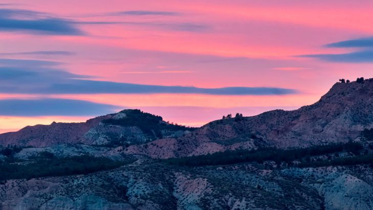 Von einem See aus fotografiert Sonnenuntergang hinter den Bergen