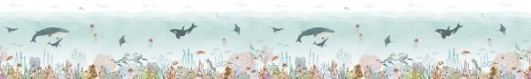 Die Farbgebung ist sanft und harmonisch, mit einem ruhigen hellblauen Hintergrund, der die Illusion von klarem Seewasser erzeugt. Die feinen Farbtonakzente und das verspielte Linienmuster machen das Ganze luftig und freundlich. Dieses Design ist ideal für Kinderzimmer oder Babyzimmer, in denen Ruhe und Verwunderung zusammenkommen.