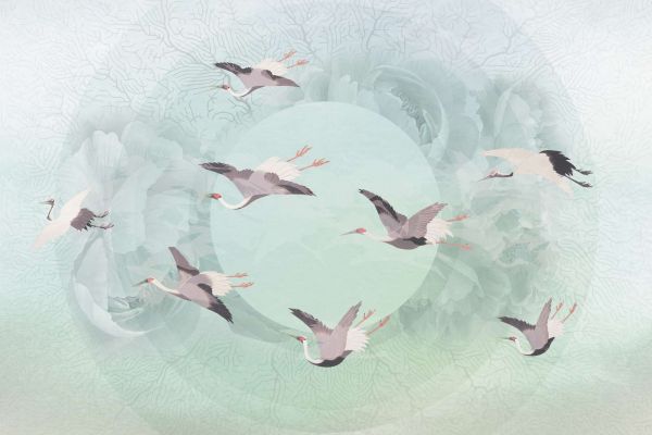 Dieses bezaubernde Design zeigt Kraniche im Flug, ein Symbol für Anmut und Harmonie. Die Vögel bewegen sich durch einen ätherischen Hintergrund aus Pastellrosa-, Blau- und Grüntönen, der durch sanfte florale Akzente subtil hervorgehoben wird. Kreisförmige Schichten verleihen Tiefe und erzeugen ein Gefühl von unendlicher Weite. Die Kombination aus natürlichen Elementen und luftigen Farben verleiht jedem Raum ein Gefühl von Ruhe und Ausgeglichenheit.