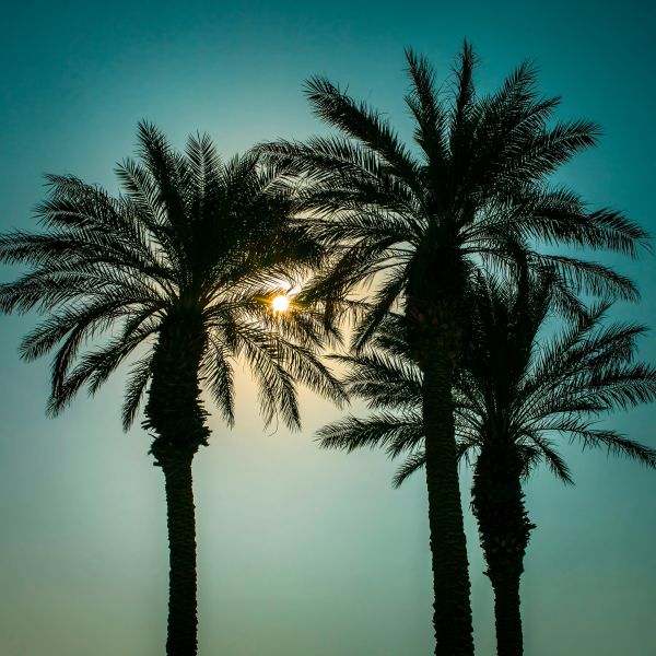 Fototapete von Palmen mit durchscheinender Sonne.